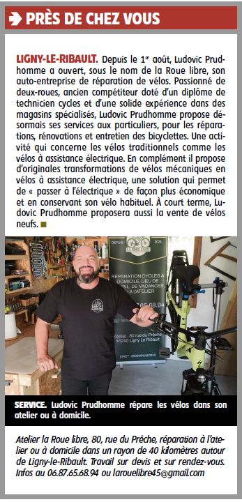 LA ROUE LIBRE 45, c'est avant tout une passion pour le vélo depuis tout jeune et un engagement à vous offrir un service de proximité et de qualité. Forts de notre expérience depuis plus de 10 ans dans le cycle, nous mettons notre expertise à votre service pour que vous puissiez profiter pleinement de vos déplacements à vélo, en toute sécurité. Réparateur se déplace à domicile et reçoit à l'atelier sur rendez-vous. Nous sommes situés à Ligny Le Ribault entre Orleans et Blois et intervenons dans toute la région et dans la limite du 41 jusqu' a BLOIS.